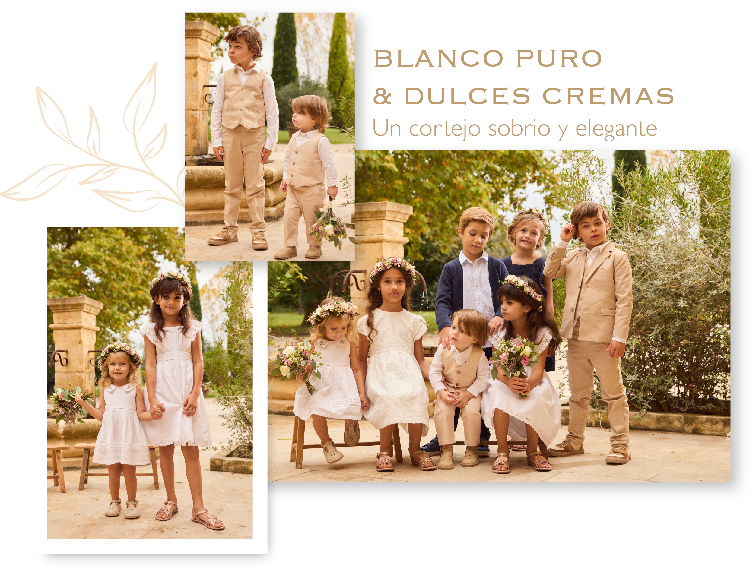 Las niñas llevan vestidos blancos con delicados bordados, mientras que los niños se distinguen por trajes de tres piezas en tonos crema, compuestos por chaleco, chaqueta y pantalón largo.