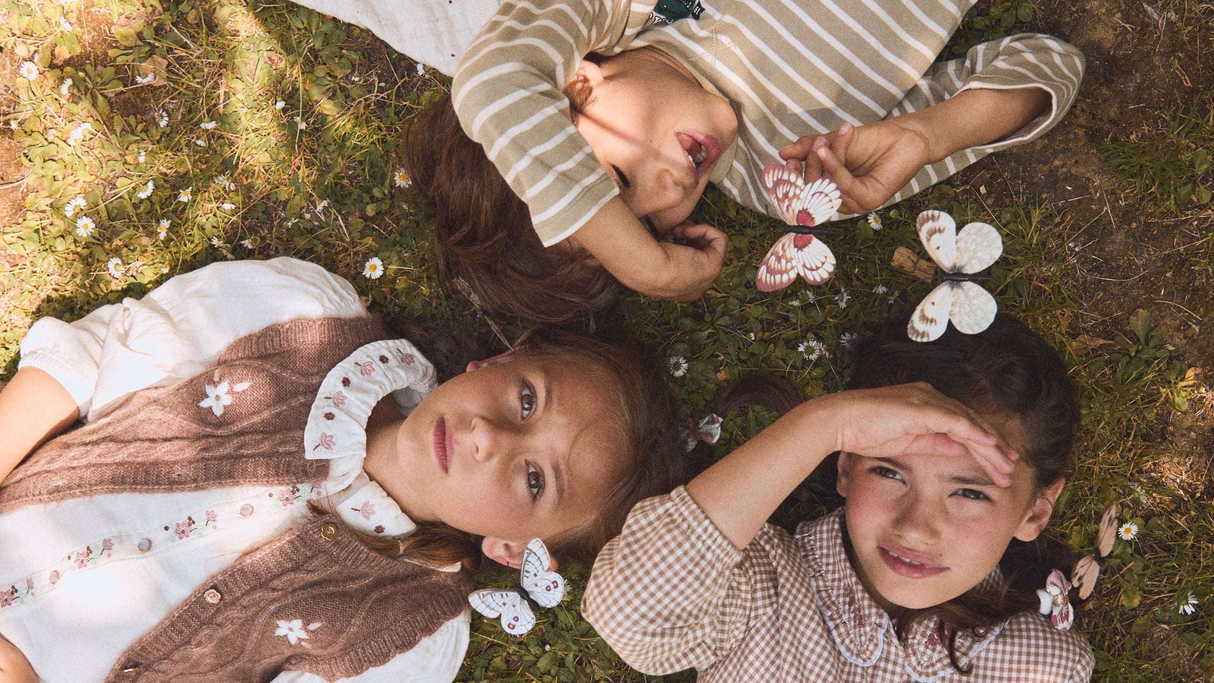 Para las chicas, las flores florecen bajo el cielo invernal en tonos de azul intenso y amarillo soleado.