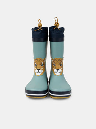 Botas de lluvia azules con parche de cabeza de leopardo para niño