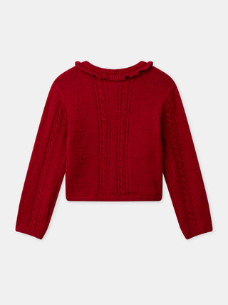 Para las encantadoras niñas, ideal para las temporadas suaves. Este cardigan rojo de punto calado es ligero y delicado, con un elegante cuello con volantes. Su textura aireada aporta comodidad y estilo, perfecto para combinar con cualquier atuendo.