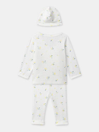 Para las pequeñas curiosas, ideal para la temporada de primavera. Top de sujetador y pantalones acanalados, abertura cruzada y botones a presión. Estampado de ramas florales y gorro a juego, estilo tierno y natural.