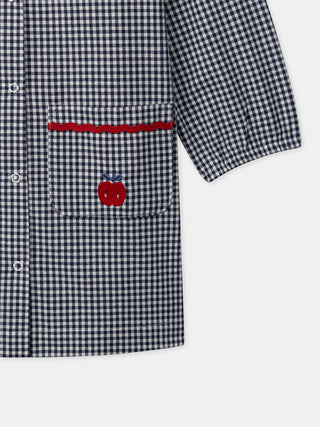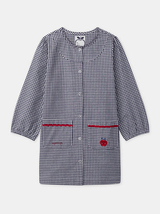 Este delantal de cuadro marino y blanco para chicas combina suavidad y elegancia, ideal para actividades creativas o el regreso a clases. Fabricado en tejido de cuadros, presenta dos bolsillos delanteros con bordados de "sergent major" y manzana, además de recortes rojos para un toque de color. Práctico, tiene puños de mangas elásticos y un cierre de botones a presión para un ajuste fácil.