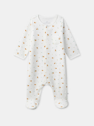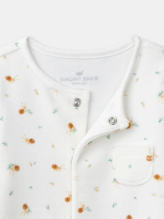 Para los bebés curiosos desde el nacimiento. Terciopelo con algodón orgánico, apertura frontal con botones de presión. Estampado de caracoles y pequeño bolsillo sobre un fondo ecru, estilo suave y campestre.