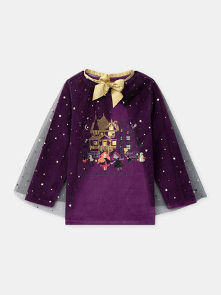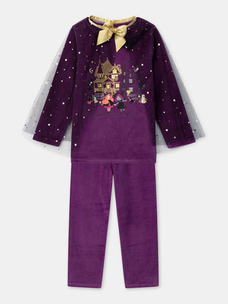 Parfait pour les enfants qui aiment se déguiser et rêver, ce pyjama accompagne les soirées fraîches d’automne. Conçu en velours doux, il se porte confortablement et s’accompagne d’une cape légère en tulle. Ses motifs phosphorescents de petites sorcières et sa cape étoilée transportent l’enfant dans l’univers magique d’Halloween.