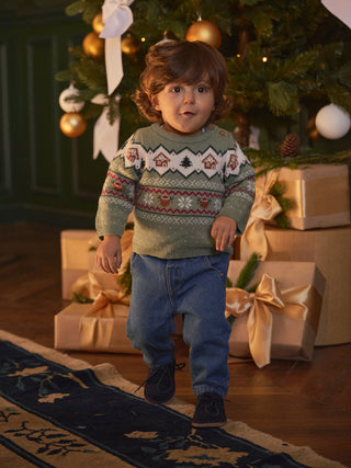 Para bebés curiosos y sonrientes en invierno, este suéter los envuelve en suavidad y calidez. Tejido fino con apertura de botón en el cuello para facilitar el vestido. Jacquard navideño con renos, árboles y copos de nieve para momentos festivos en familia.